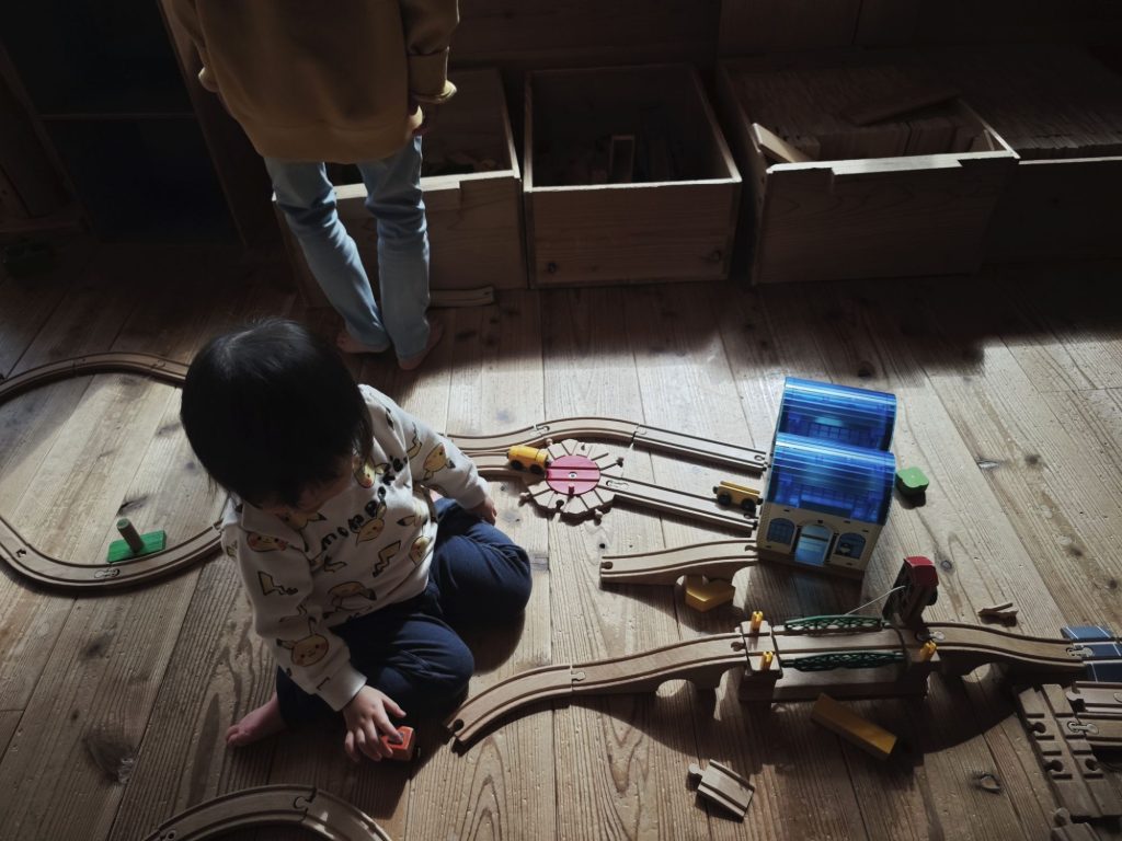 その後は気を取り直して、木材のレールを組み合わせて電車を走らせるおもちゃに夢中。成長しましたね…